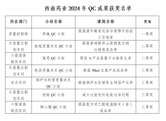 为深入学习贯彻党的二十大精神和习近平总书记关于质量提升重要论述精神,推动质量强国建设,进一步激发员工参与质量改进的积极性,提高全员质量意识。近日,西南药业2024年QC成果发表会在公司第三会议室隆重举行。公司常务副总经理蒋猛和副总经理黄世琼出席会议并担任评委,各部室、车间负责人、QC小组活动相关人员、质量管理人员、班组长及QC小组活动积极分子等近100人参加会议。